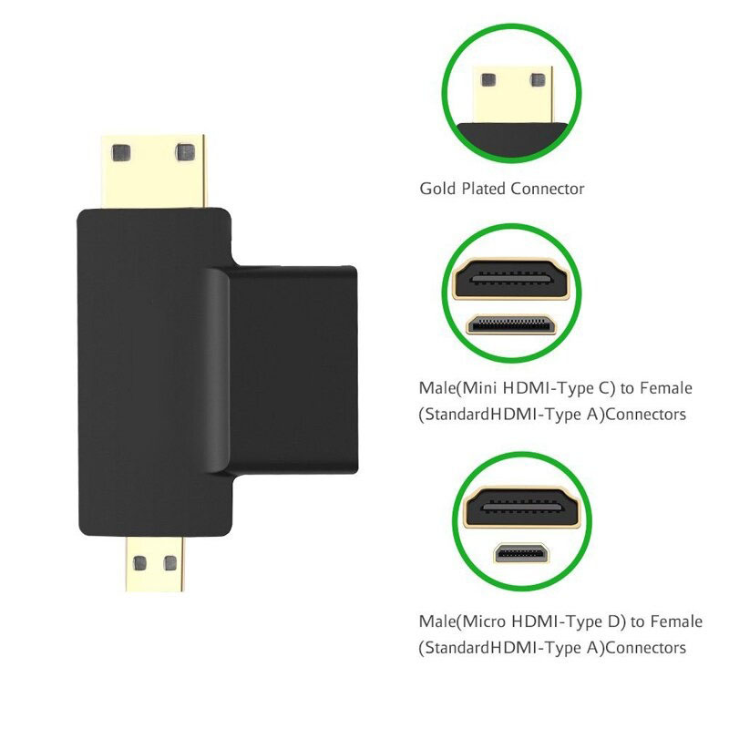 Deze 3-in-1 T-vormige voor HDMI adapter kunt u passen uw standaard HDMI kabel naar Micro HDMI of Mini HDMI. Deze adapter is gemaakt van hoge kwaliteit materialen en heeft een langdurige ontwerp. Met superieure kwaliteit en structuur, dit is een fantastische waarde product.