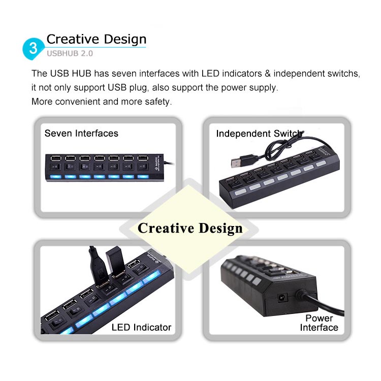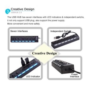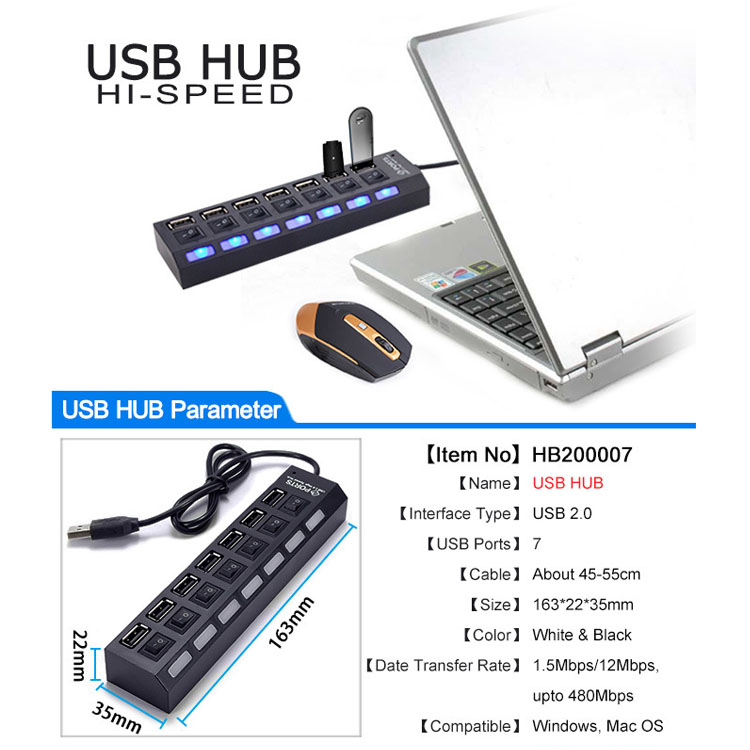 7 poorten LED USB 2.0 Adapter Hub aan/uit Schakelaar Voor PC Laptop BK LED indicator lichten Ingebouwde USB kabel Plug en play 43 cm