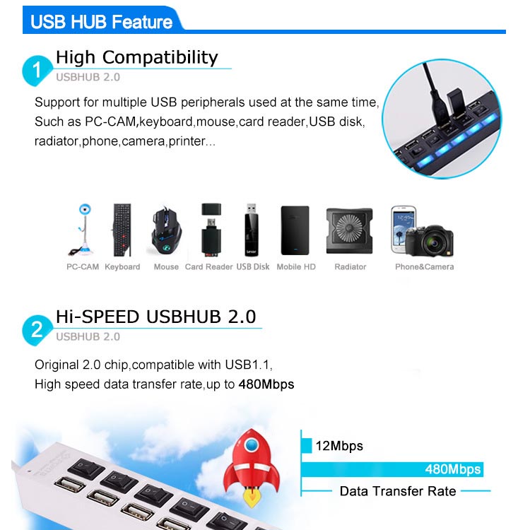 Ontworpen met 7-poorten, deze compacte USB 2.0 High-speed hub is klein genoeg voor reizen, en staat genoeg om uw Connectiviteit behoeften.