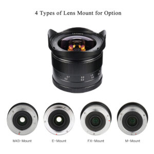 7artisans 12 mm F2.8 Ultra-groothoeklens met 10 elementen in 8 groepen voor betere optische controle van de controle. Hoogwaardig optisch glas met multi-layer coating helpt om de flare te voorkomen, blijf een hoog contrast met de randen. Met 7 diafragma-bladen kunt u in de onscherpte aangename bokeh krijgen achtergrond van je foto’s. 7artisans 12mm F2.8 is gemaakt van aluminium metalen behuizing, weegt 0.65lb / 295g, wat het duurzaam, compact en lichtgewicht.