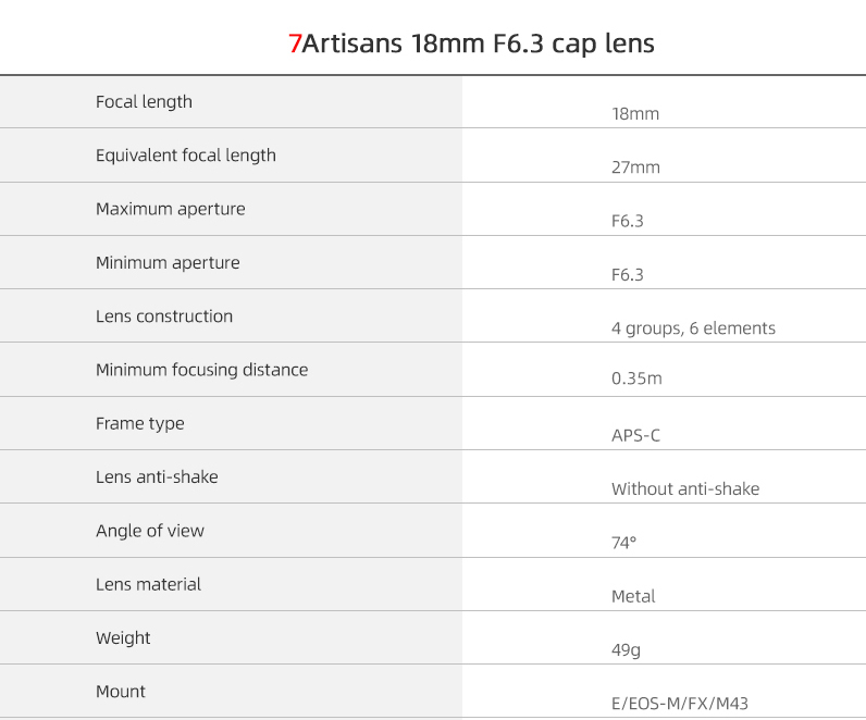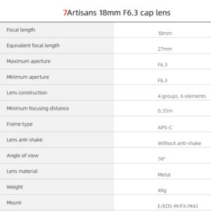 7artisans 18 mm F6.3 Ultradun lens met 6 elementen in 4 groepen voor betere optische controle van de controle. Hoogwaardig optisch glas met multi-layer coating helpt om de flare te voorkomen, blijf een hoog contrast met de randen. 7artisans 18mm F6.3 is gemaakt van aluminium metalen behuizing, weegt 49g, wat het duurzaam, compact en lichtgewicht.