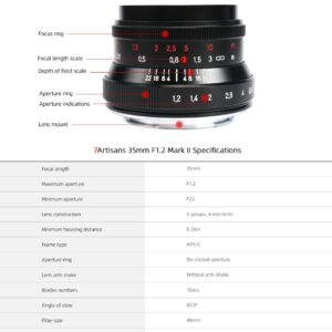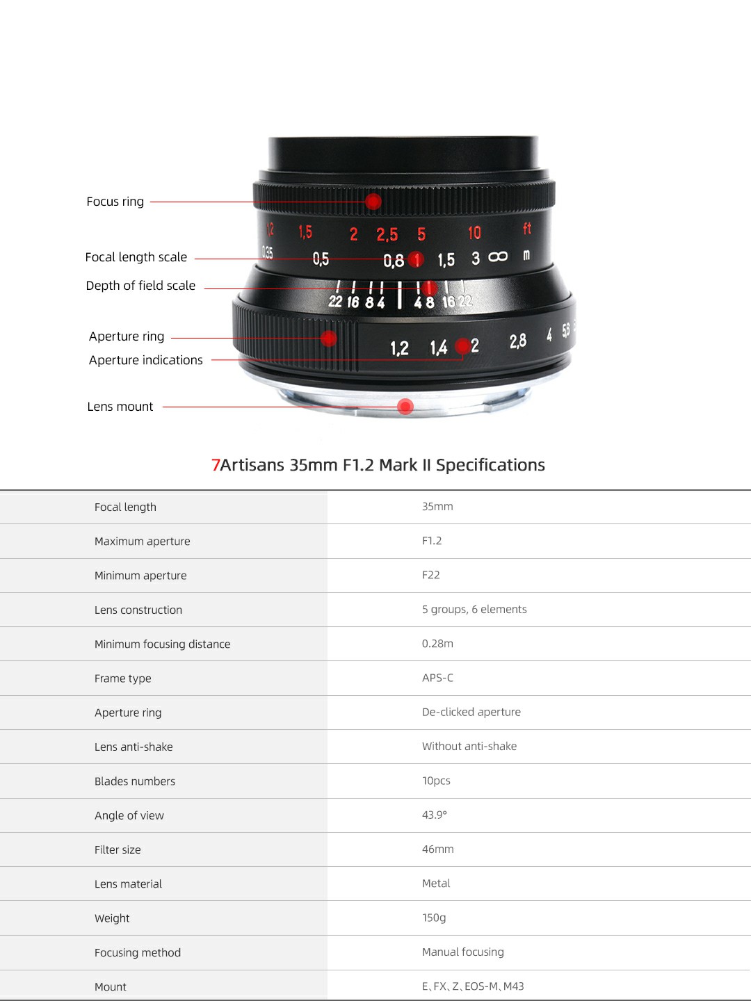 De 7artisans 35mm F1.2 Mark II heeft een minimale scherpstelafstand van maar 28 centimeter en een brandpuntafstand van 35mm, waarmee u alles kunt vastleggen! Dit objectief is geschikt voor Olympus en Panasonic systeem cameras. Met het snelle f/1.2 diafragma is de lens zeer geschikt in omstandigheden met slecht licht. De brandpuntsafstand van 35mm maakt het bovendien mogelijk om alles vast te leggen, van close-up portretfotos tot aan groothoeklandschappen. Hierdoor is het objectief ideaal voor reis- of reportagefotografie. Alle elementen van de lens zijn voorzien van een meerlaagse coating voor het optimaliseren van de beeldkwaliteit en de lichttransmissie. Het diafragma van de 7artisans 35mm f/1.2 Mark II is opgebouwd uit afgeronde diafragmabladen. Dit zorgt voor een zachte weergave van onscherpe delen in uw opnames, zeker als u fotografeert met een open diafragma.