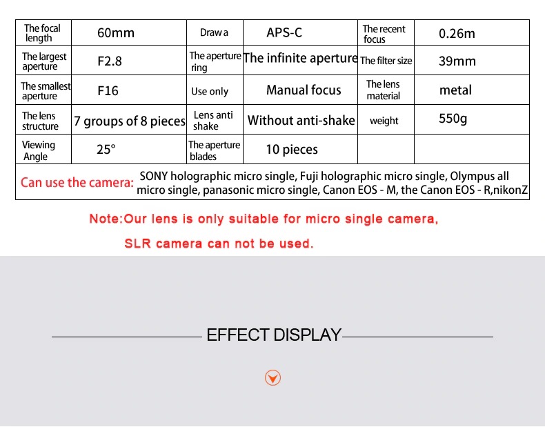 4. APS-C Frame Type, het ondersteunt werken met Mirrorless Camera ‘S en biedt de 90mm equivalent brandpuntsafstand, die is zeer ideaal voor macro schieten, zoals insect fotografie.