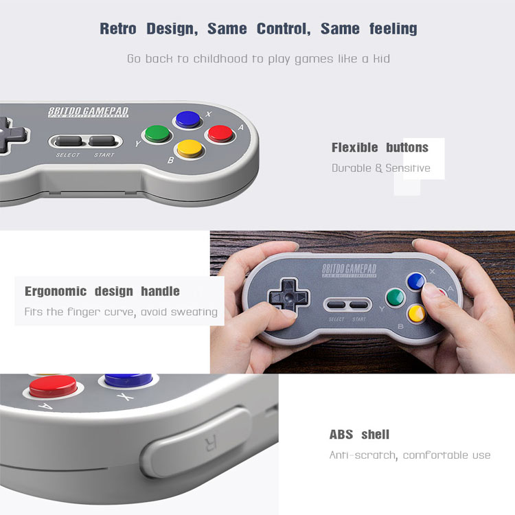 8 Bitdo SF30 draadloze game controller, met klassieke D-pad en knop layout, herinnert u van retro 8-bit game consoles uit de jaren en 90’s. De 8 Bitdo SF30 draadloze game controller werkt met uw telefoon te spelen apps met een game controller met echte tactiele ingang. Het ondersteunt ook voor Windows, Android, macOS, Stoom, Voor Nintendo Switch. 8 Bitdo SF30 draadloze game controller is de beste voor vechten, schieten actie en emulator games.