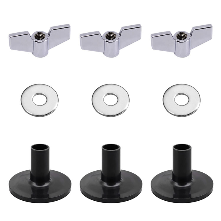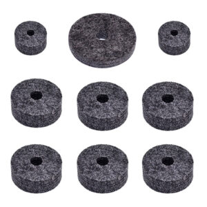 3 、 Product afmetingen: 3 x cimbaal mouw, base (8-10mm), 6 x cimbaal vilt (8-10mm), 2 x hoge hoed clutch vilt (6-8mm), 1 x hoge hoed cup vilt (6-8mm), 3 x wing moer (8mm) en 3 x washer (8mm)