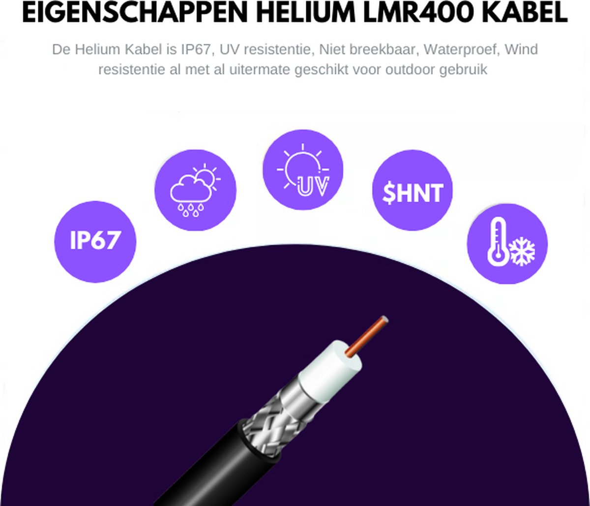 Voor een optimale HNT opbrengst is een hoge kwaliteit kabel noodzakelijk. Deze LMR 400 kabel is van zeer hoogwaardige kwaliteit en een zeer laag signaal verlies, waardoor het een grote afstand van uw Helium Hotspot Miner naar de antenne kan overbruggen.
