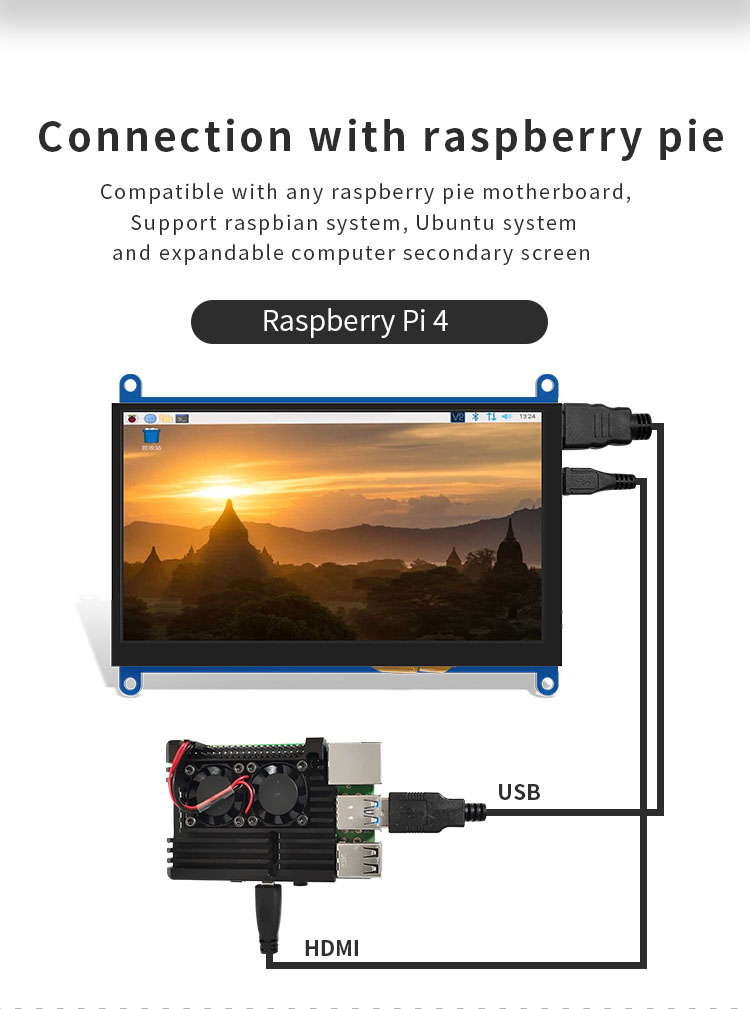 Gebruikt als een raspberry pi display dat ondersteunt Raspbian, Ubuntu, Kali-Linux, Kodi, win10 IOT, single-touch, gratis drive.