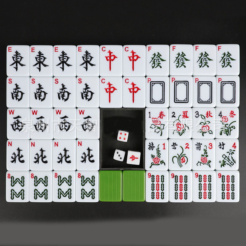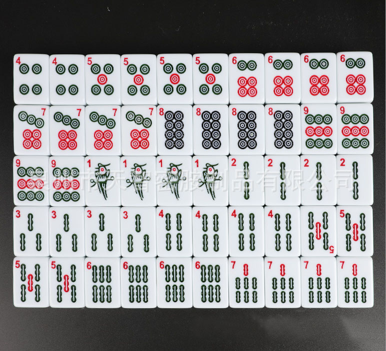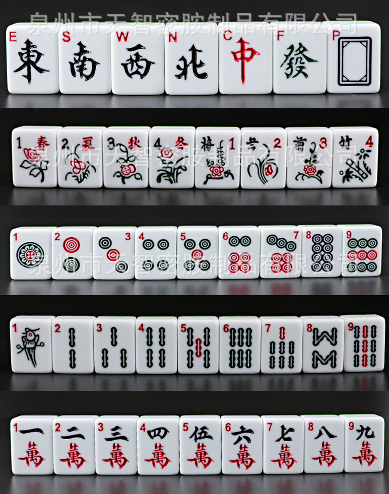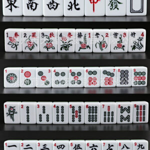 -144 tegels omvatten 36 cirkels, 36 bamboos, 36 tekens, 12 draken (rood, groen, wit), 16 winden (noord, oost, spouth, west), 8 bloemen en seizoenen