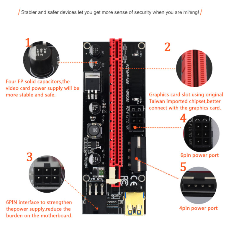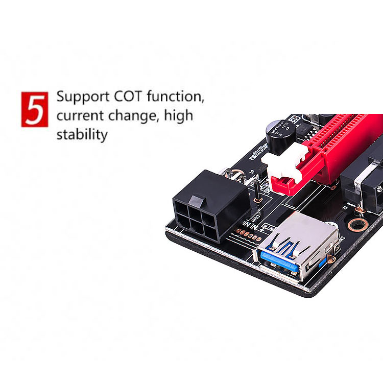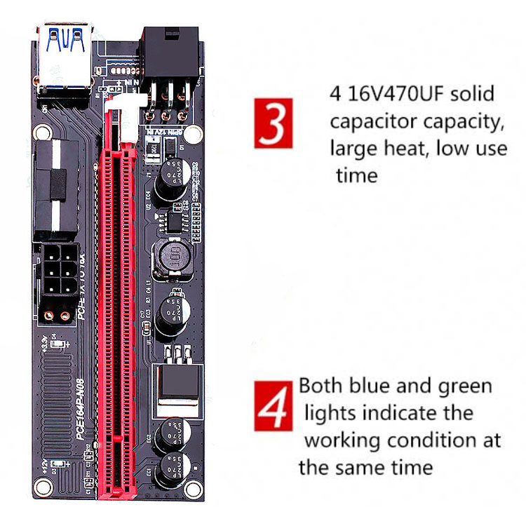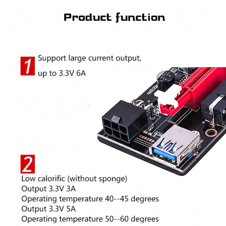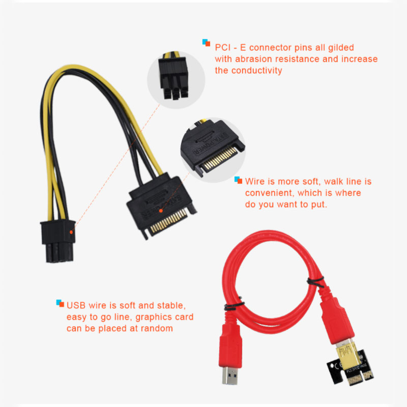 Letop: deze riser biedt 3 verschillende voedingsconnectoren (4 pins, 6 pins, in sata), maar gebruikt er slechts één. Gebruik meer dan 1 poorten om stroom te leveren zul de riser verbrandt