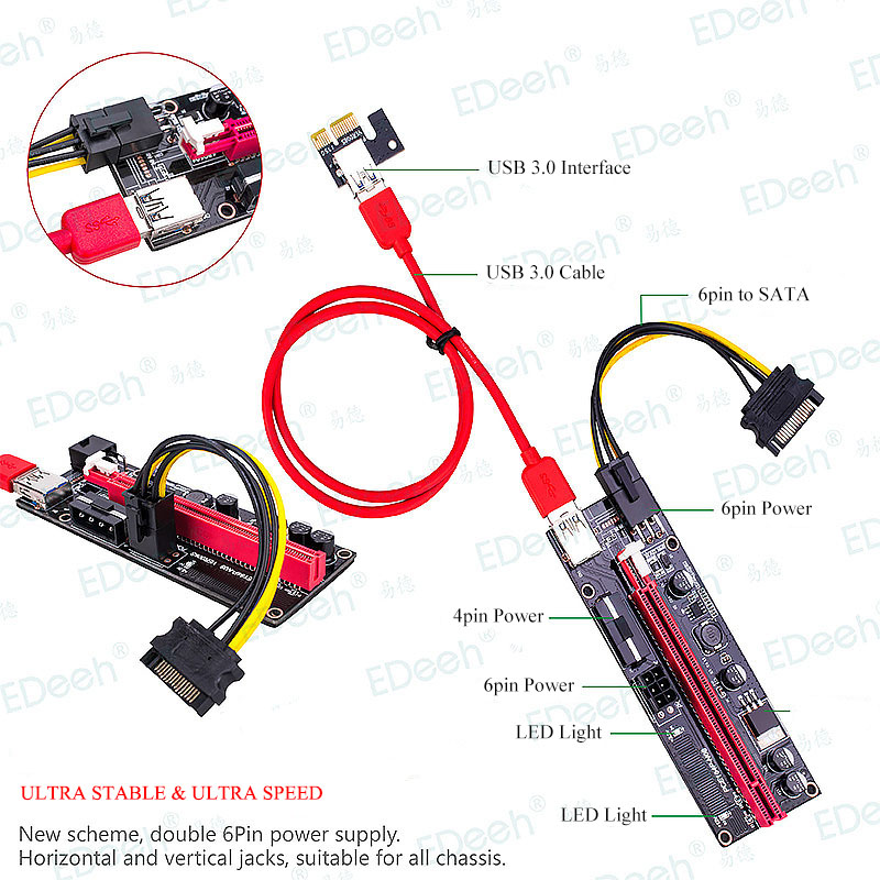 Ultrastabiel Ver009S Usb 3.0 Pci-E Riser Ver 009S Express 1X 4X 8X 16X Extender Riser Card Adapter sata 15Pin Naar 6 Pin Power Kabel ETH Mining