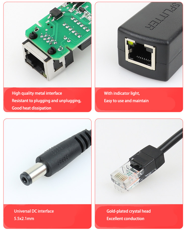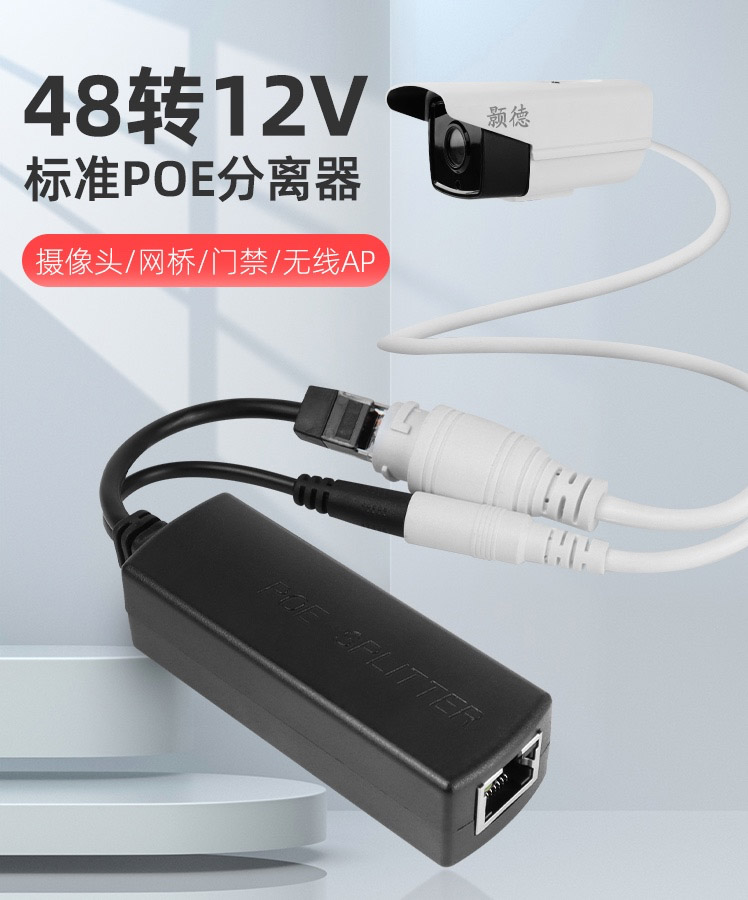 1. 48V standaard POE splitter, gebruikt met een POE switch, gemakkelijk handvat de signaaloverdracht en voeding van gewone IP camera’s.