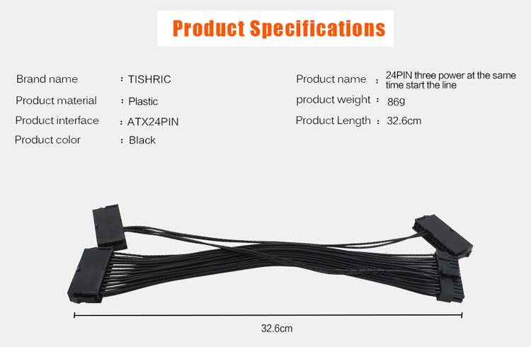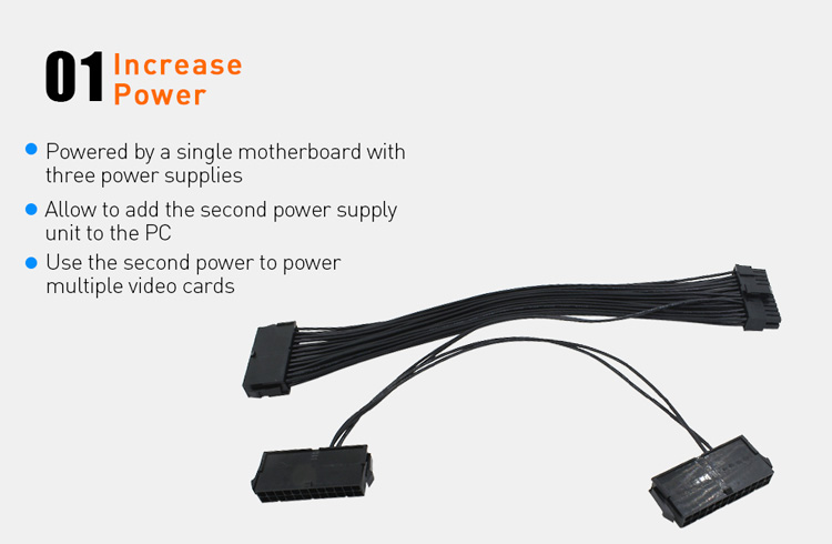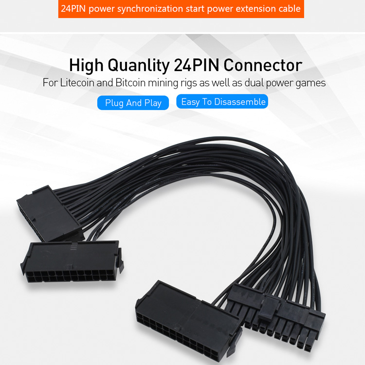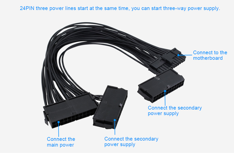 De Drie ATX 20+4 (24Pin) Molex PSU Sync Kabel wordt gebruikt om een 2de en 3de voeding aan te sluiten op grote systemen zoals Crypto Mining Rigs.