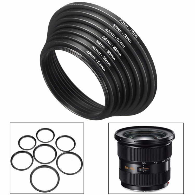U kunt ook 2 of meer adapters combineren, bijvoorbeeld 49-52 en 52-55 adapters combineren, u kunt een 55mm filter of zonnekap op uw 49mm lens gebruiken.